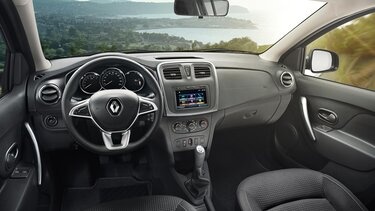 Интерьер нового «Рено Сандеро» сильно преобразился. Дизайн стал более современным, эргономика — грамотной, а также улучшились материалы отделки. В базовой комплектации установлена мультимедийная система с экраном в 3,5 дюйма.